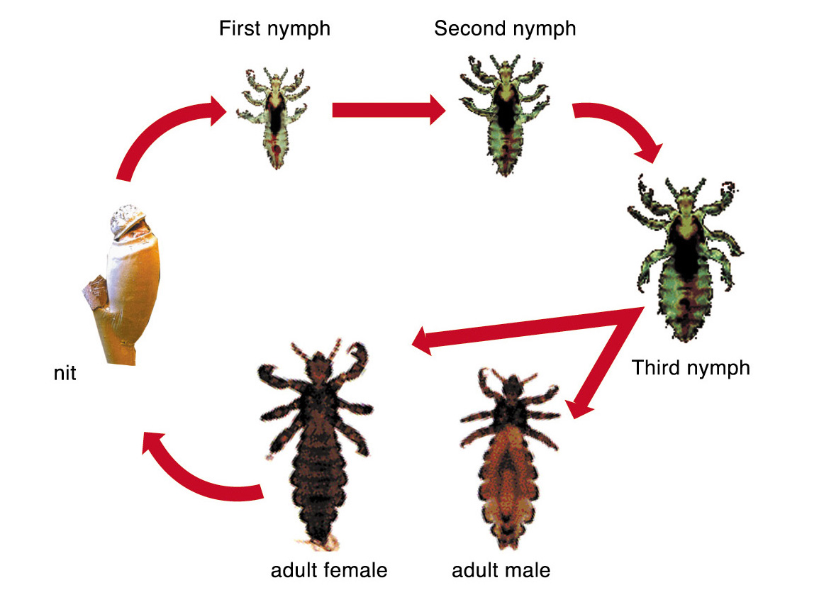 Nymfen ser i princip ut som en fullvuxen lus förutom att den är mycket mindre. Den växer till sig och ömsar skinn. Nyckläckta löss kan vara svåra att se. När de börjar suga blod syns de bättre. Tarminnehållet kan se ut som en mörk rand i kroppen.